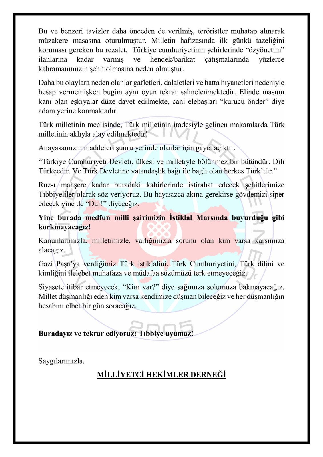 Türkiye Cumhuriyeti Devleti, milli varlığa düşman türlü ittifaklar ve komisyonlar yoluyla, “barış ve demokrasi” kılıfı altında uçurumun kenarına itilmekte­dir. Türk milletinin başına sarılan “ikinci çözüm süreci” vatanın bölünmez bütünlüğüne kastetmektedir, kabul edilemez.